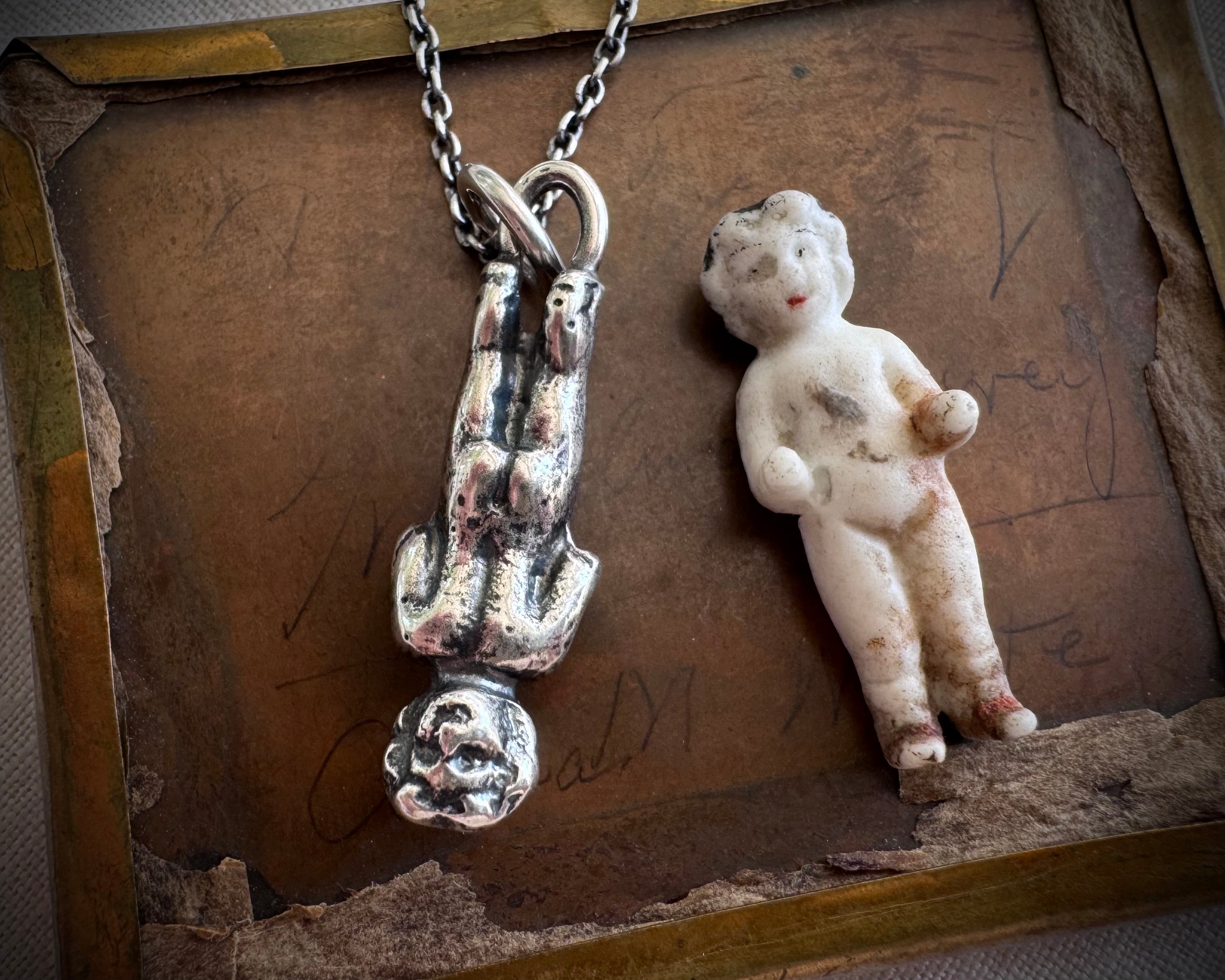 I've reconfigured a tiny antique bisque porcelain penny doll, which dates back to 1850 - 1920, and sand cast her, then finished her up in my little studio ... hand crafted jewelry because how it's made matters.