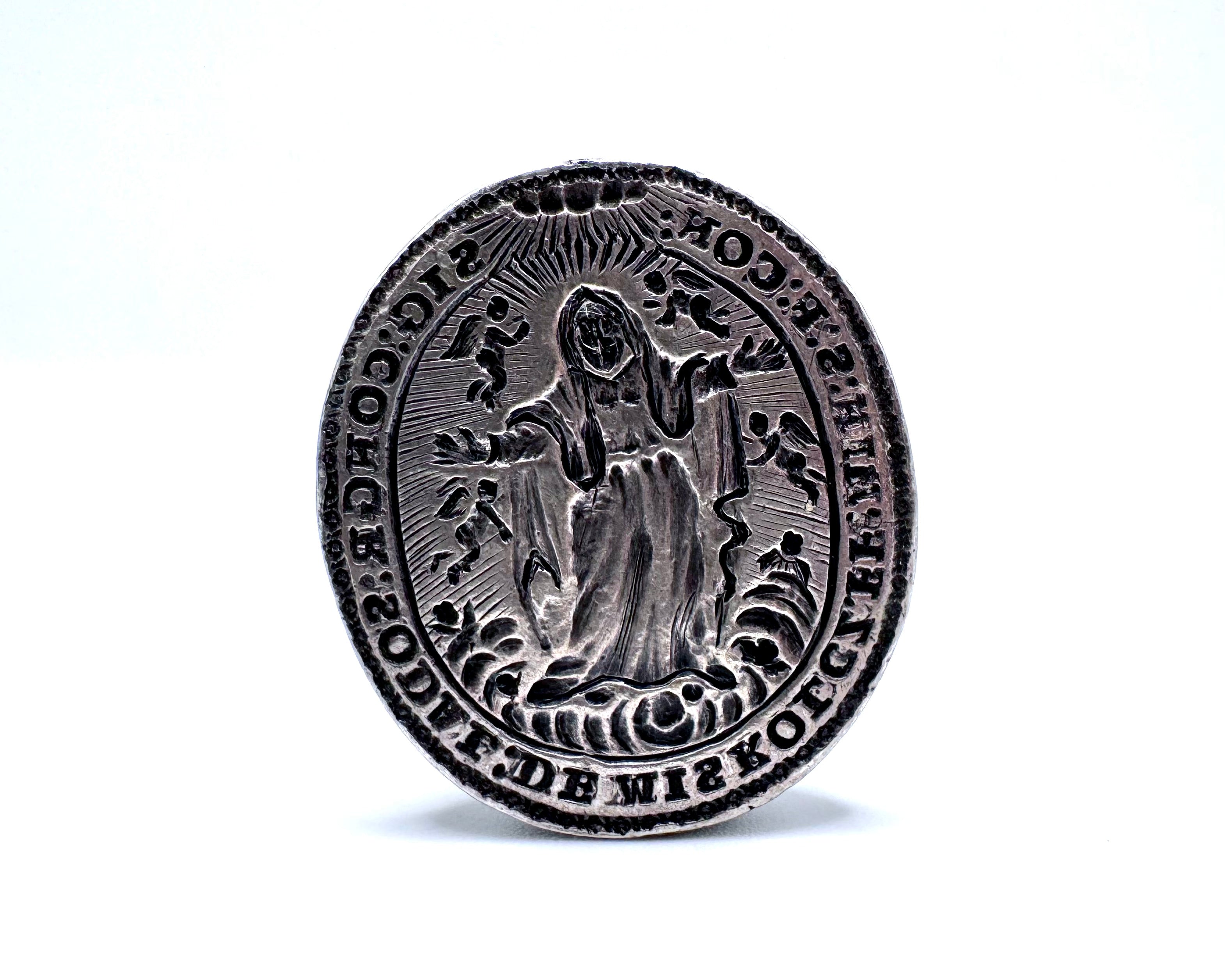 Make an impression with a lovely antique 19th century desk wax seal depicting a robed figure, it may be a guardian angel, with outstretched arms surrounded by smaller winged angels and a legend.