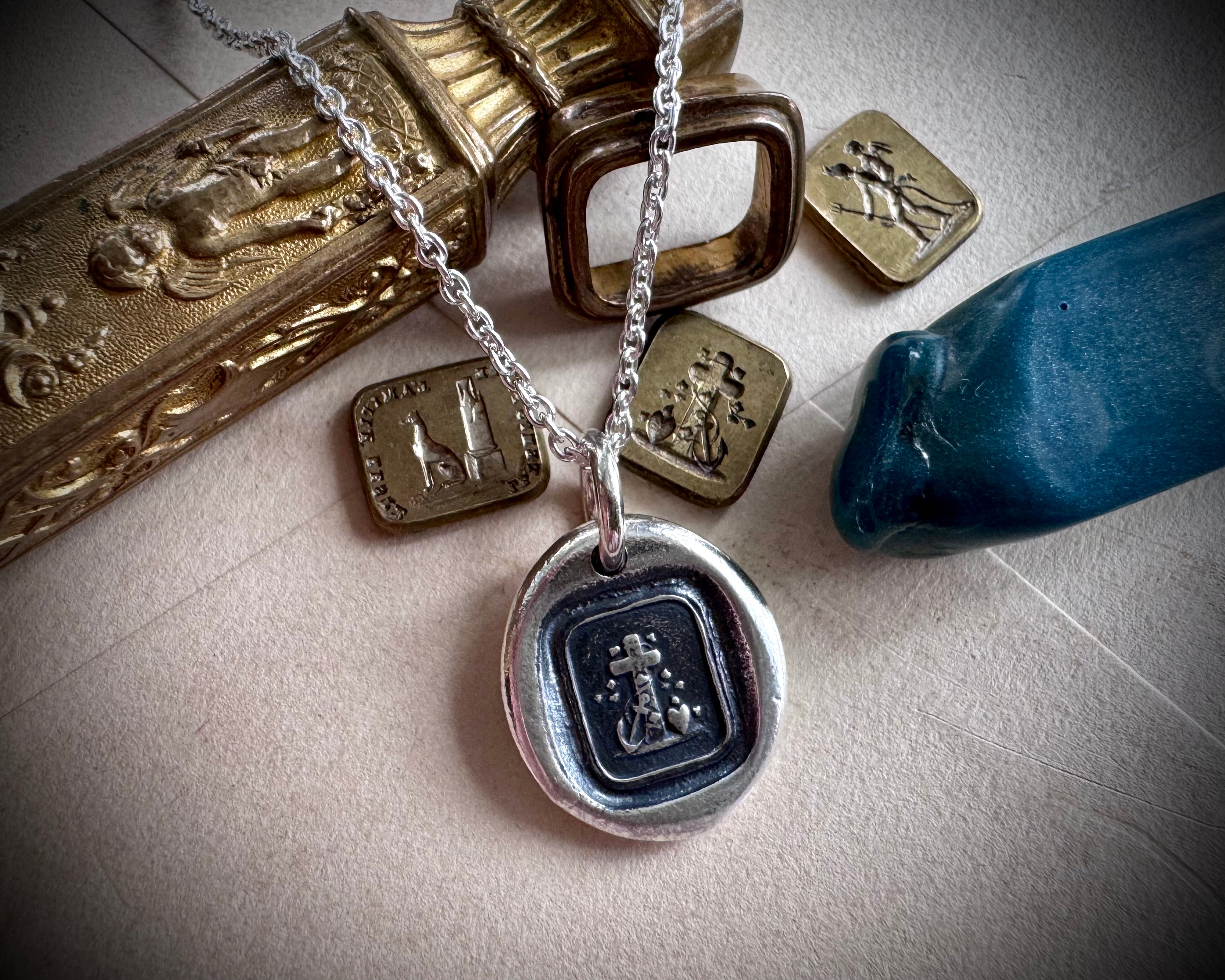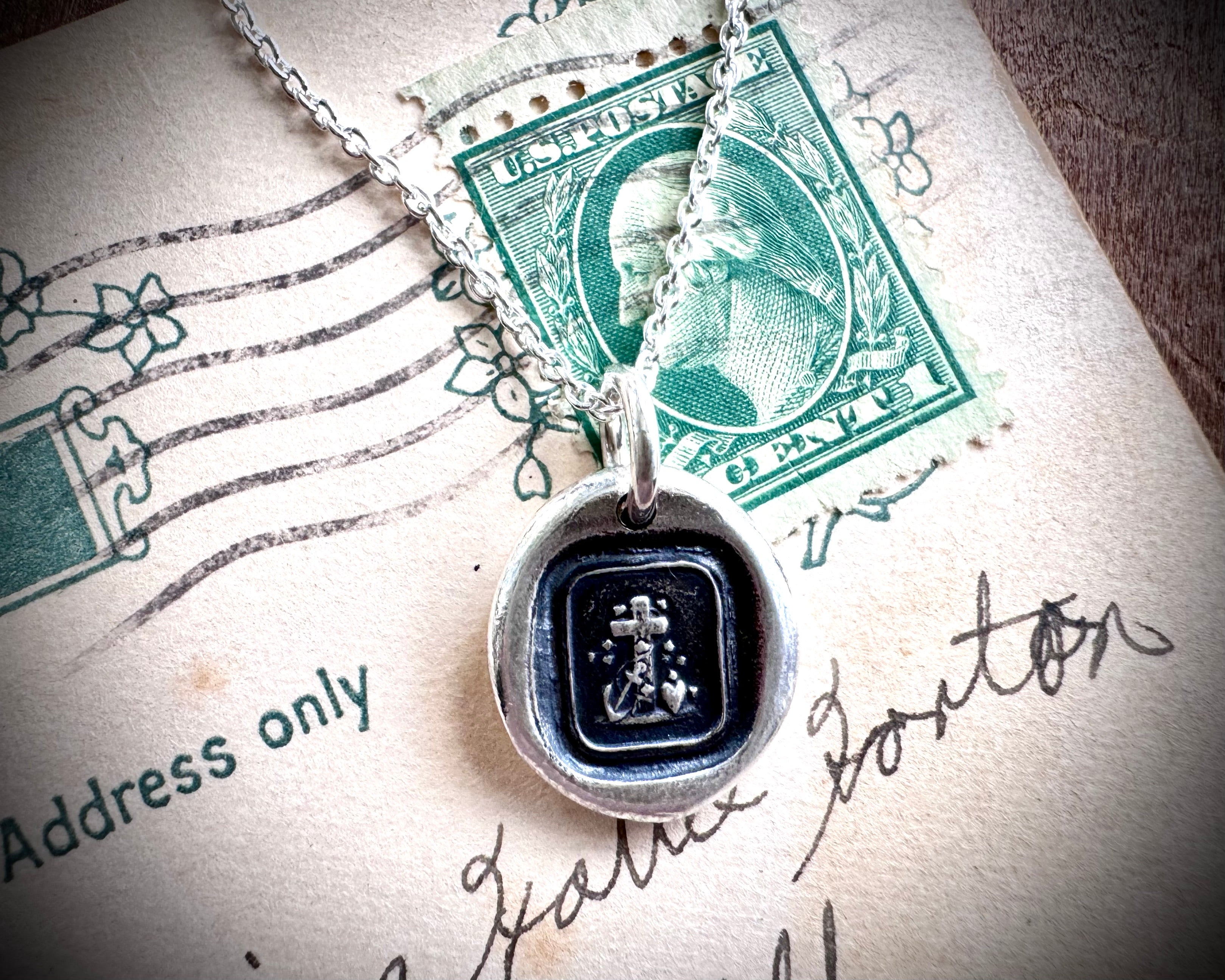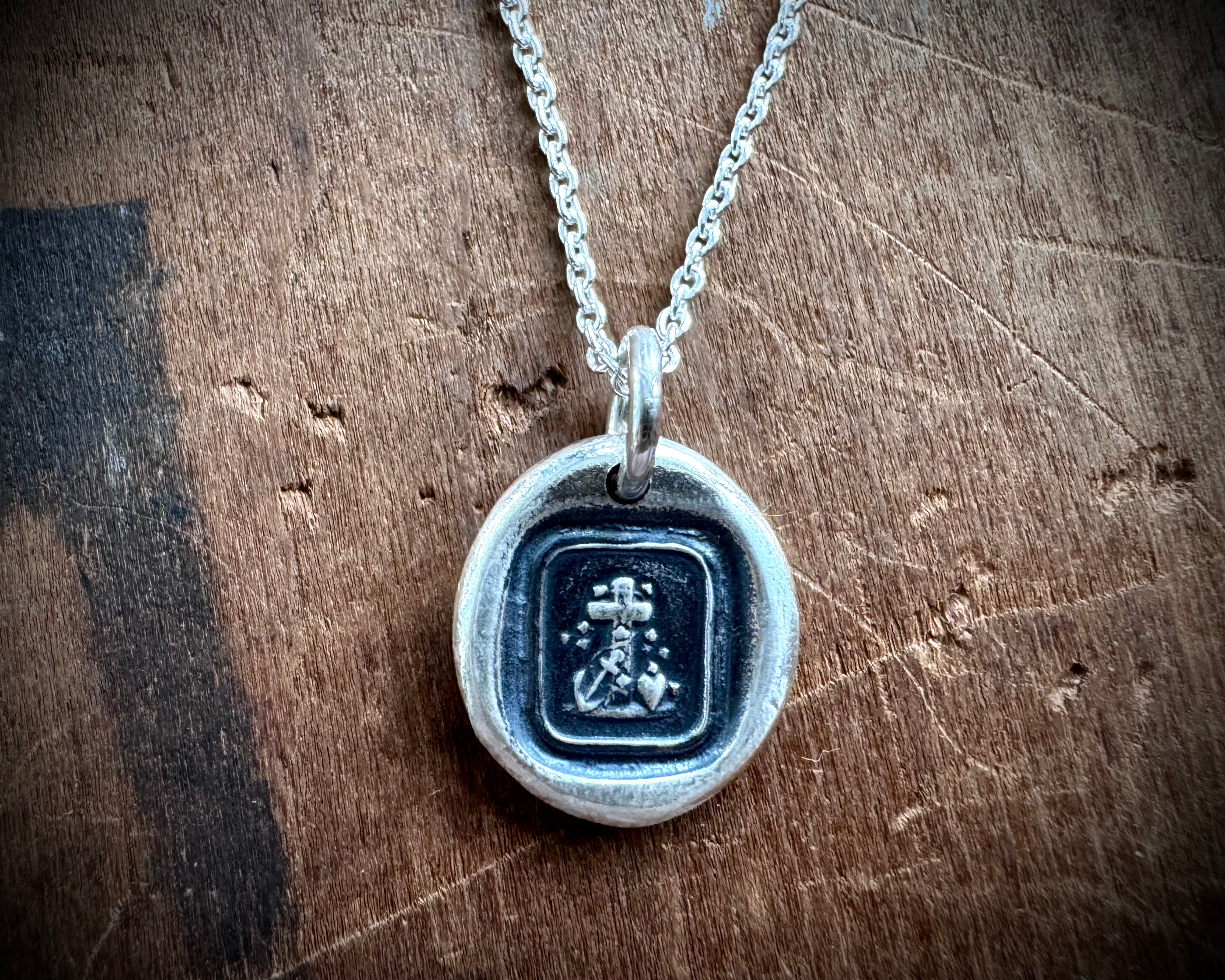 Show your faith, hope and love with a small cross wax seal necklace ... a cross, an anchor and a heart wax seal necklace pendant ... faithful wax seal jewelry.