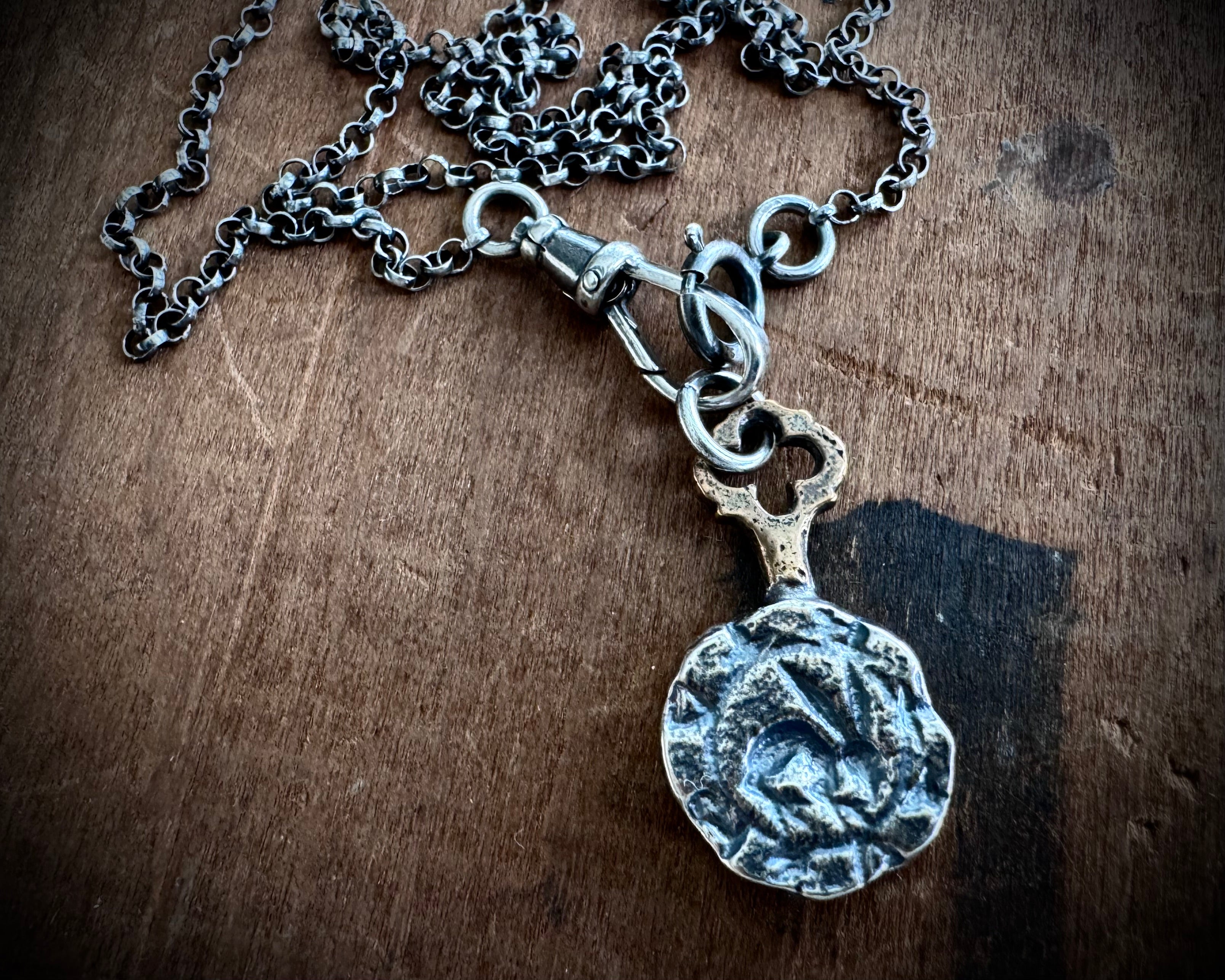I've added a portion of a rustic quatrefoil key as a bail for the pendant because the quatrefoil was a prominent design element in medieval times, appearing in architecture, heraldry, and jewelry.