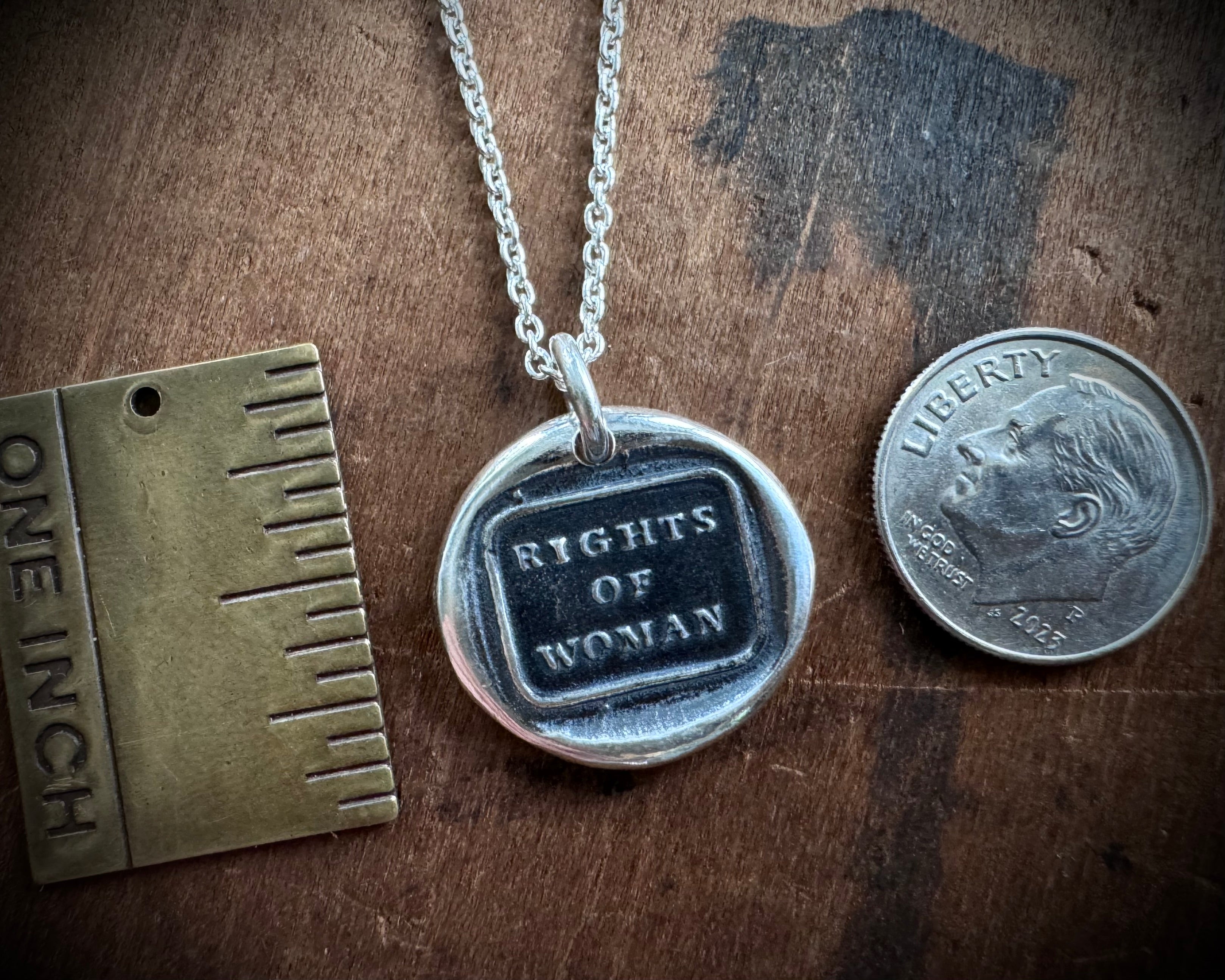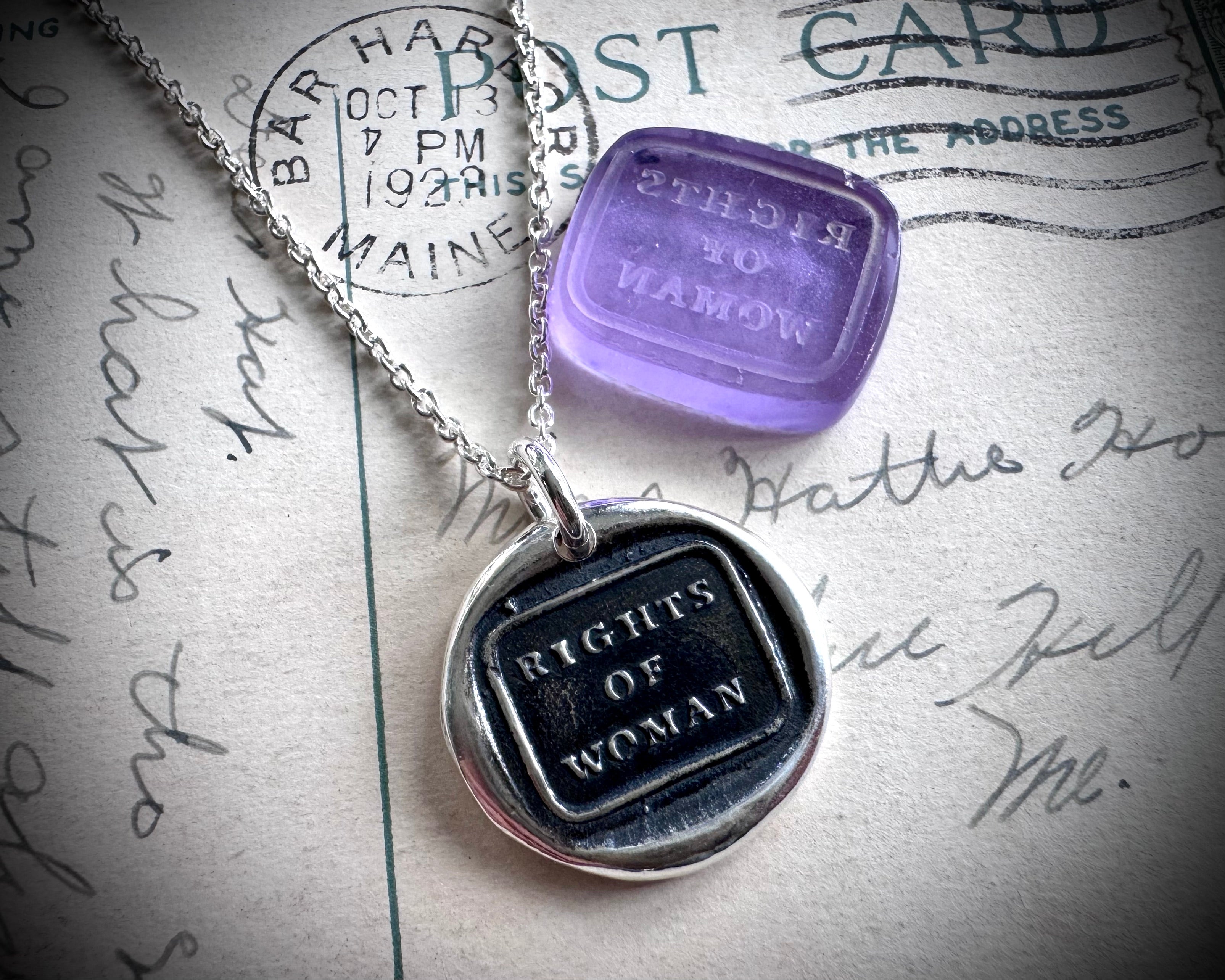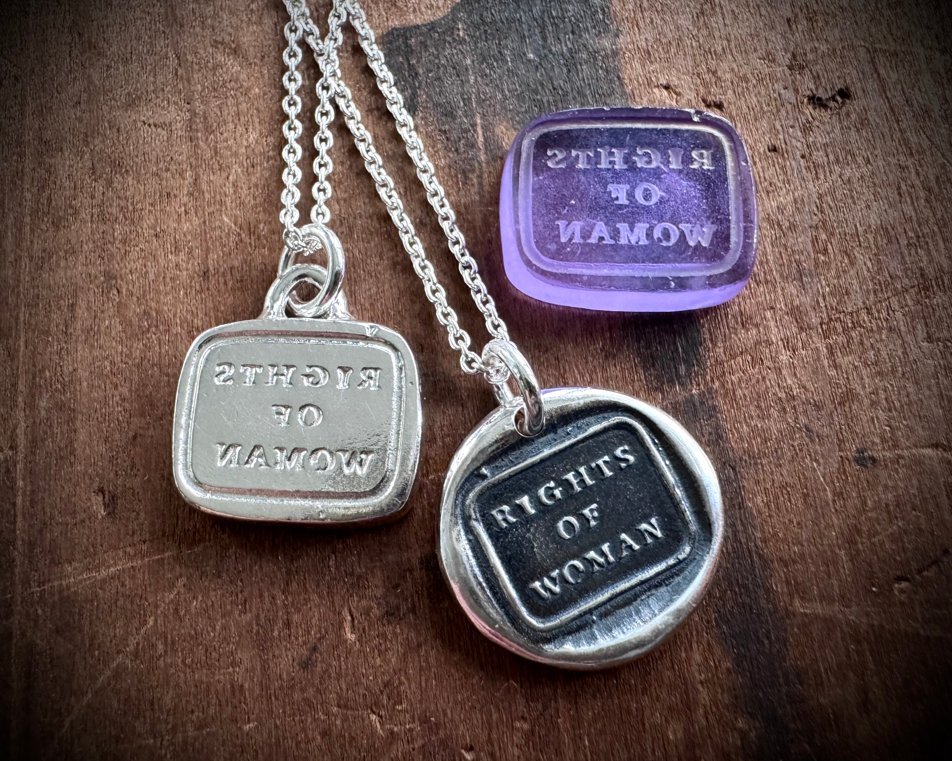 A wonderfully historic RIGHTS OF WOMAN wax seal necklace with more than a nod to women's history and the suffrage movement.