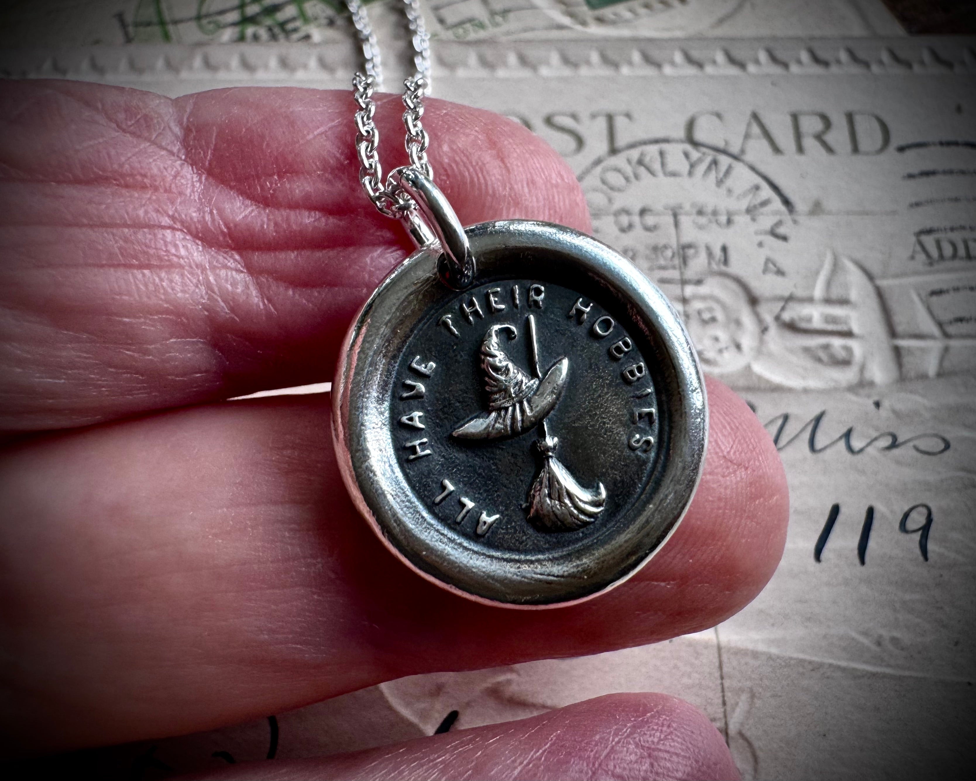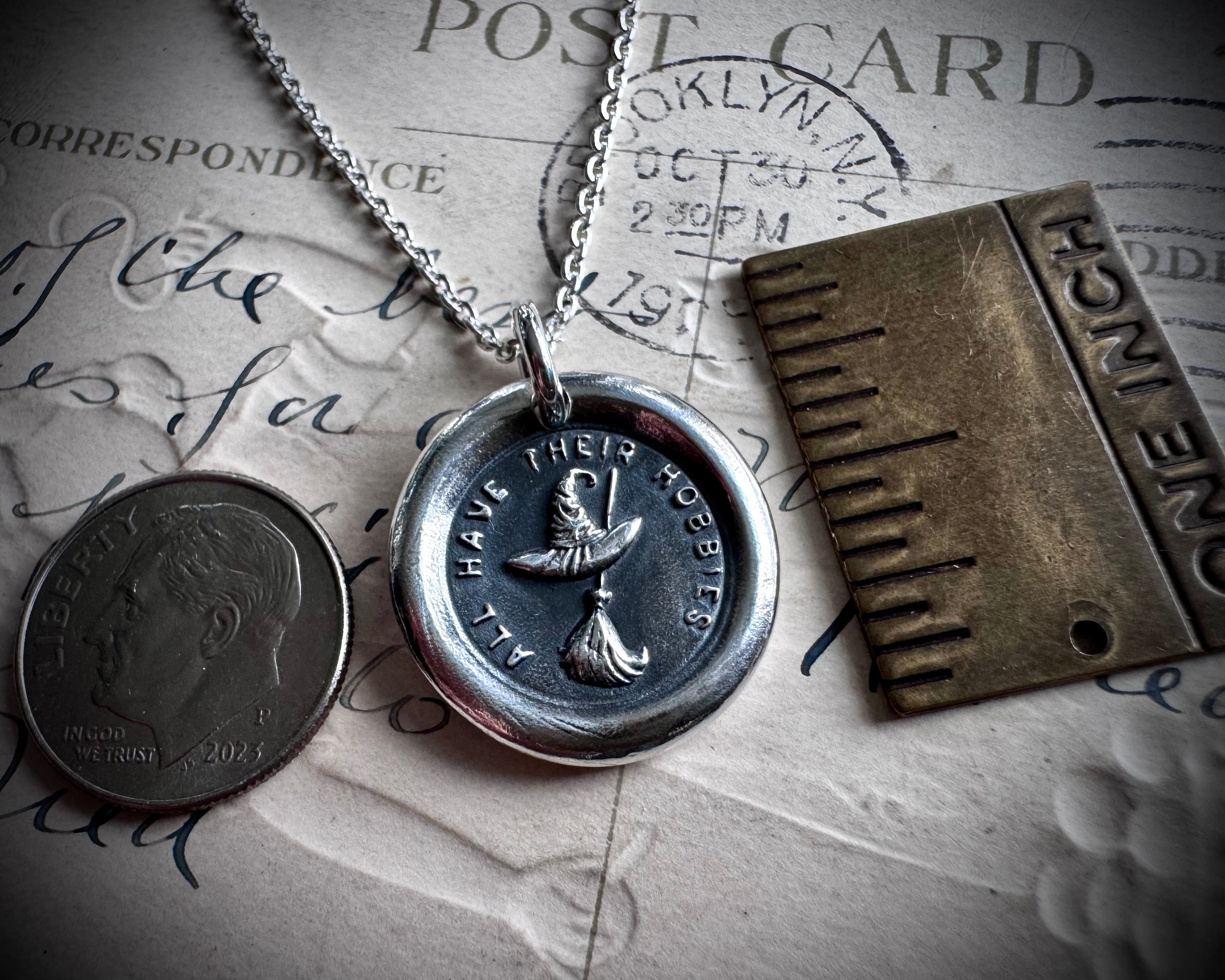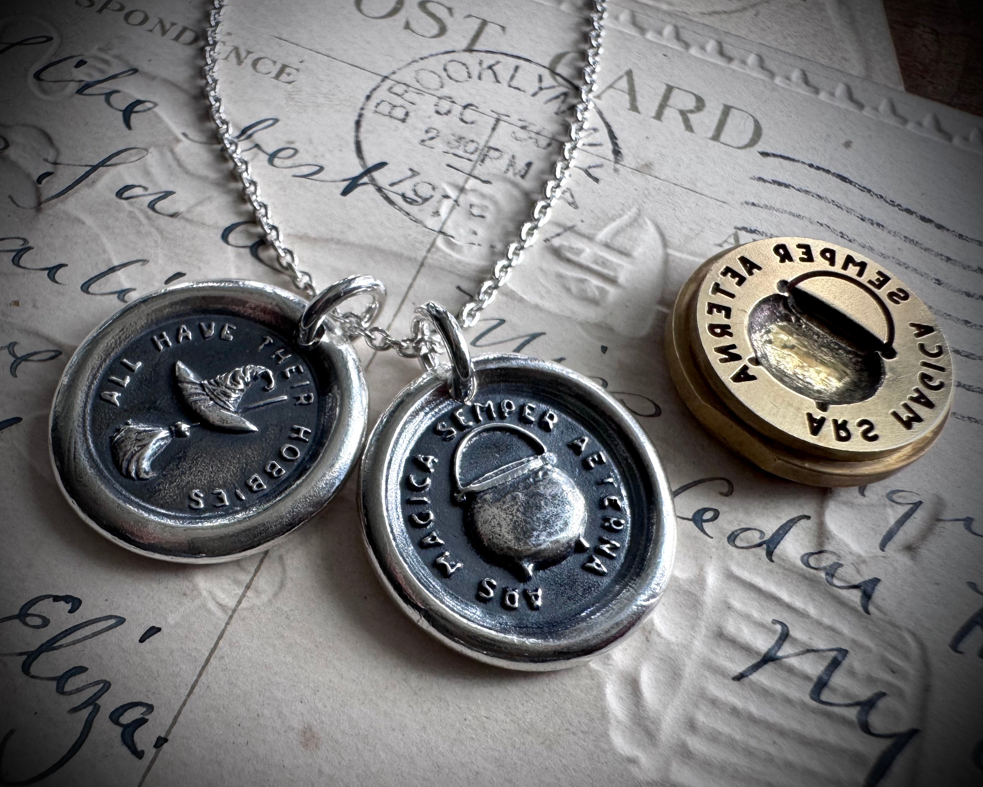 A perfectly wicked witch hat and broom wax seal necklace pendant, the imagery surrounded by the perfectly wicked sentiment ALL HAVE THEIR HOBBIES.