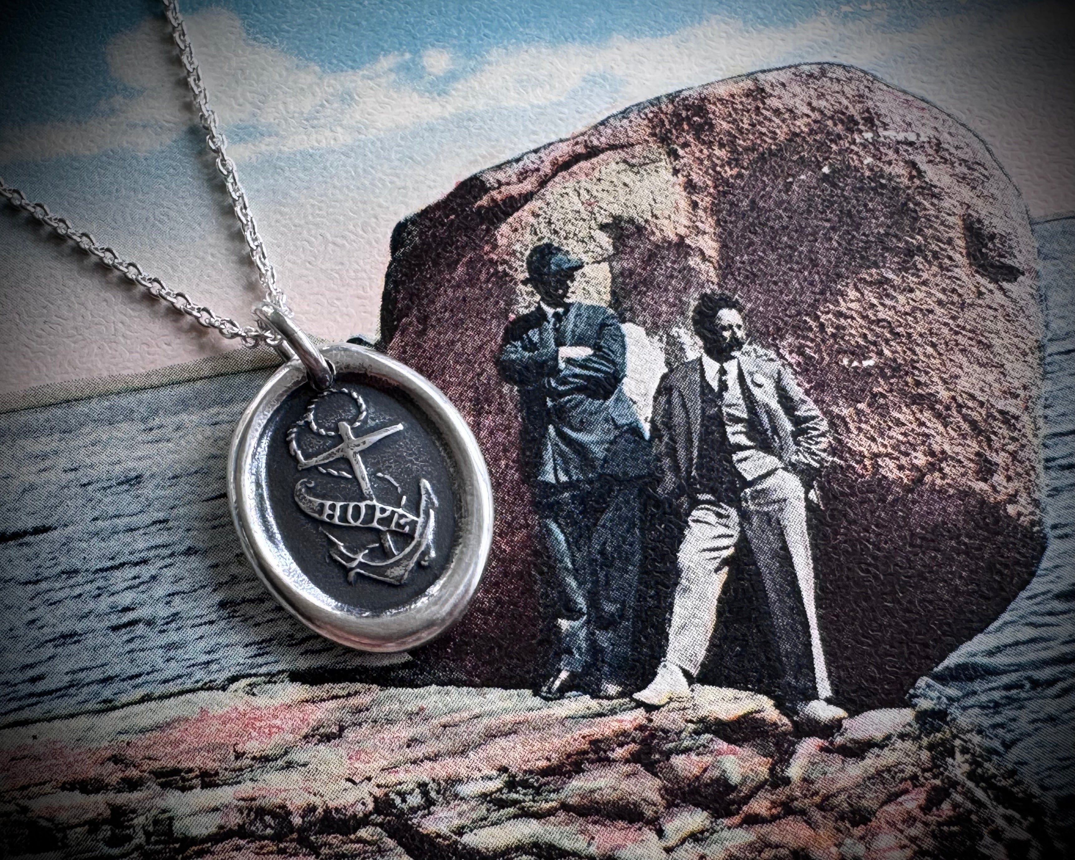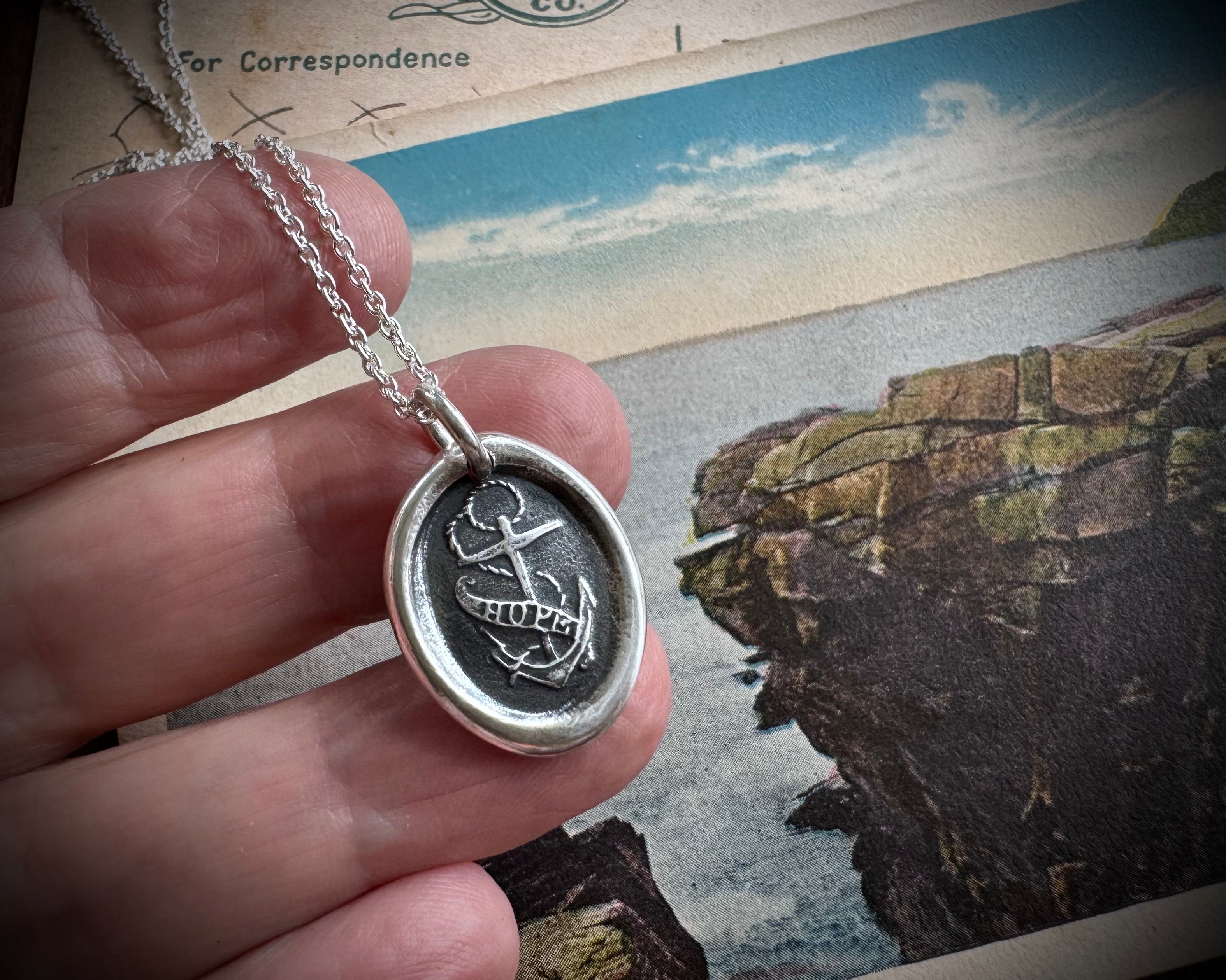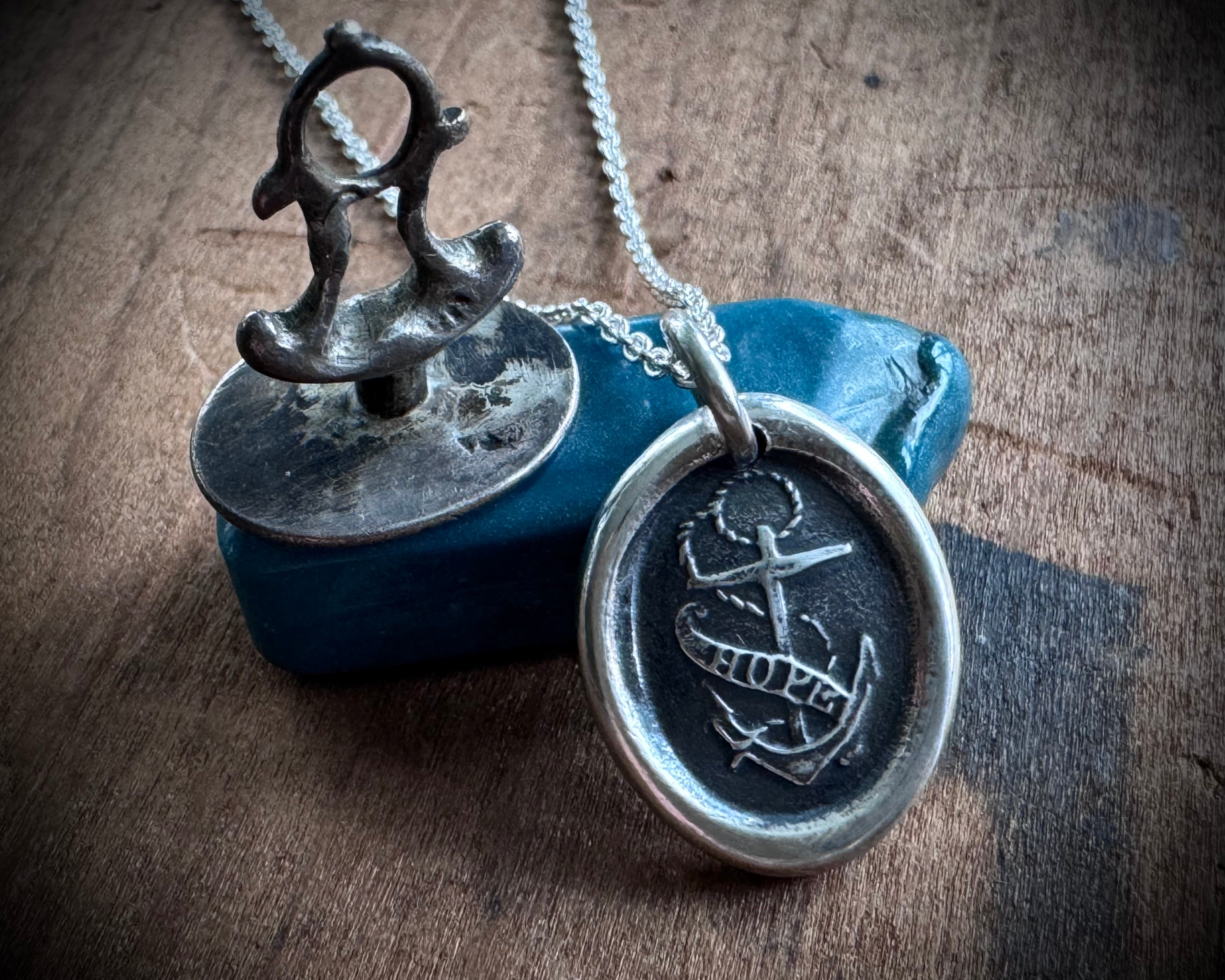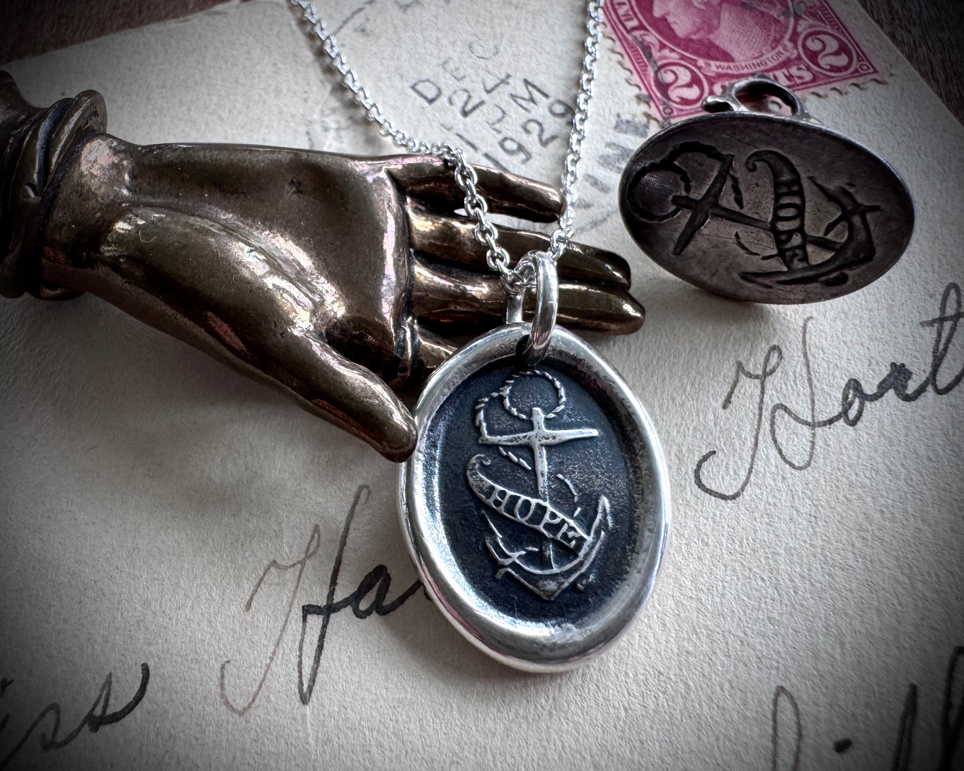 Send the message of HOPE with a lovely post medieval fouled anchor wax seal necklace pendant with a banner draped across it that reads HOPE. Inspirational wax seal jewelry.