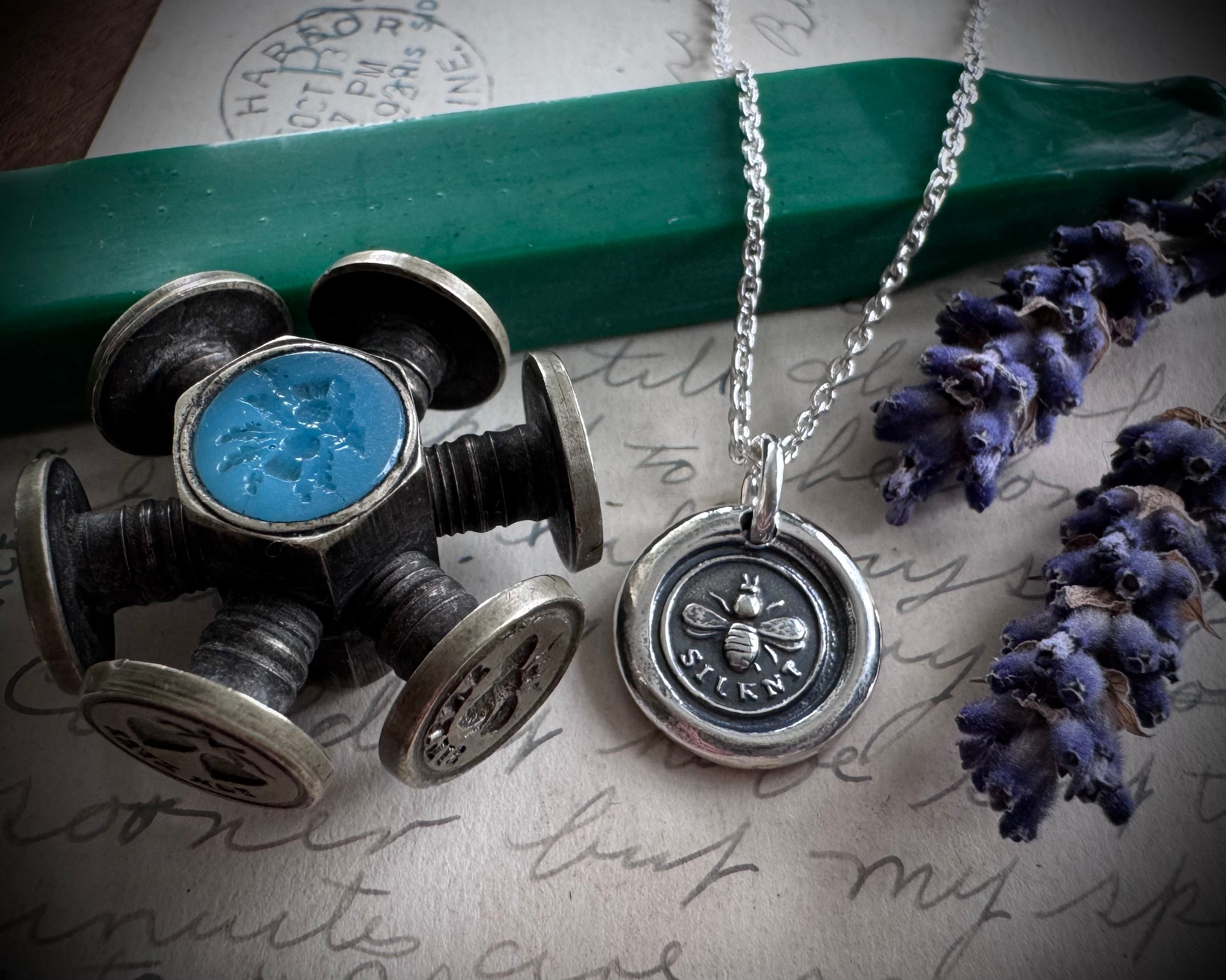 Can you keep a secret? BEE SILENT with a bee wax seal necklace pendant depicting a little bee flying above the word SILENT, and on the backside a honeycomb pattern.