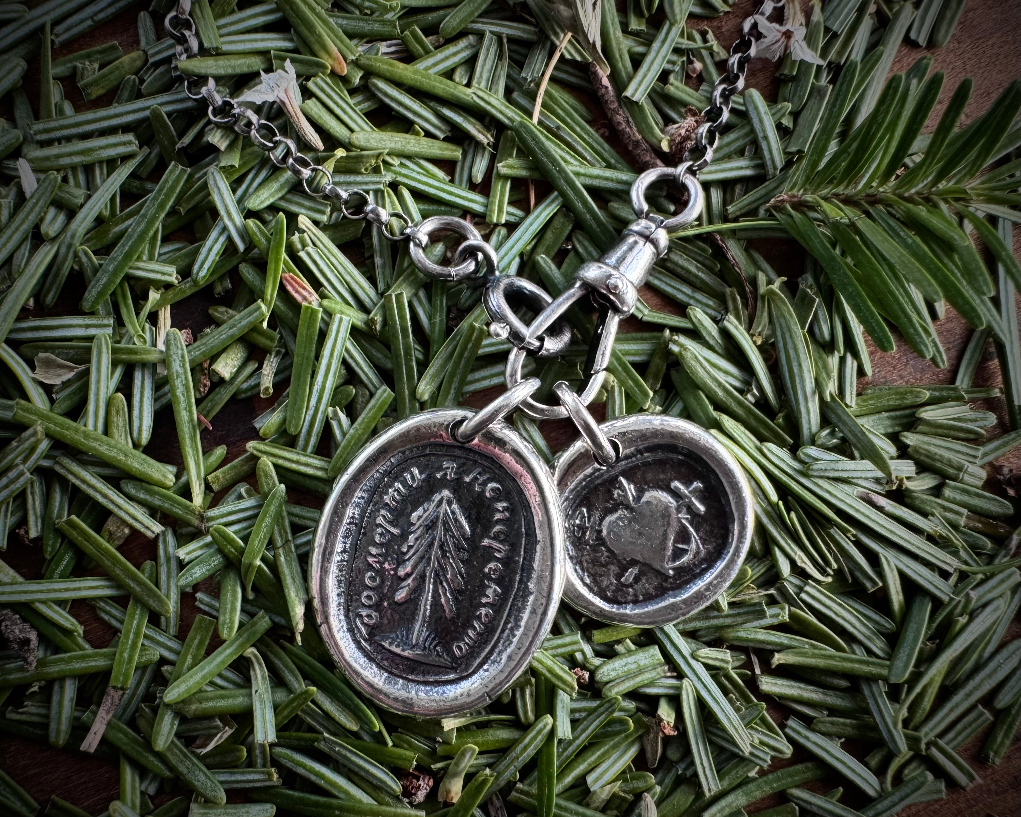 Hand crafted from an antique double ended Slavic steel wax seal that dates back to the 1800's, with the evergreen tree on one end and a flaming heart on the other. The Cyrillic alphabet is used by more than 50 languages worldwide, but most notably Russian, Bulgarian and Ukrainian.