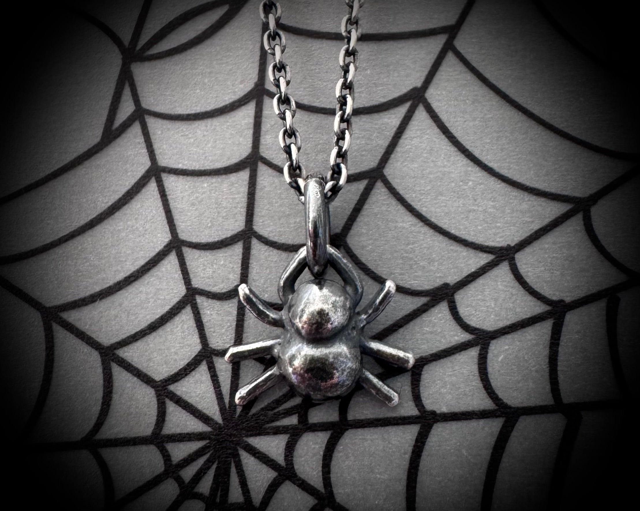 I've hand sculpted the tiny spider in jewelers carving wax and had it lost wax cast in sterling silver.